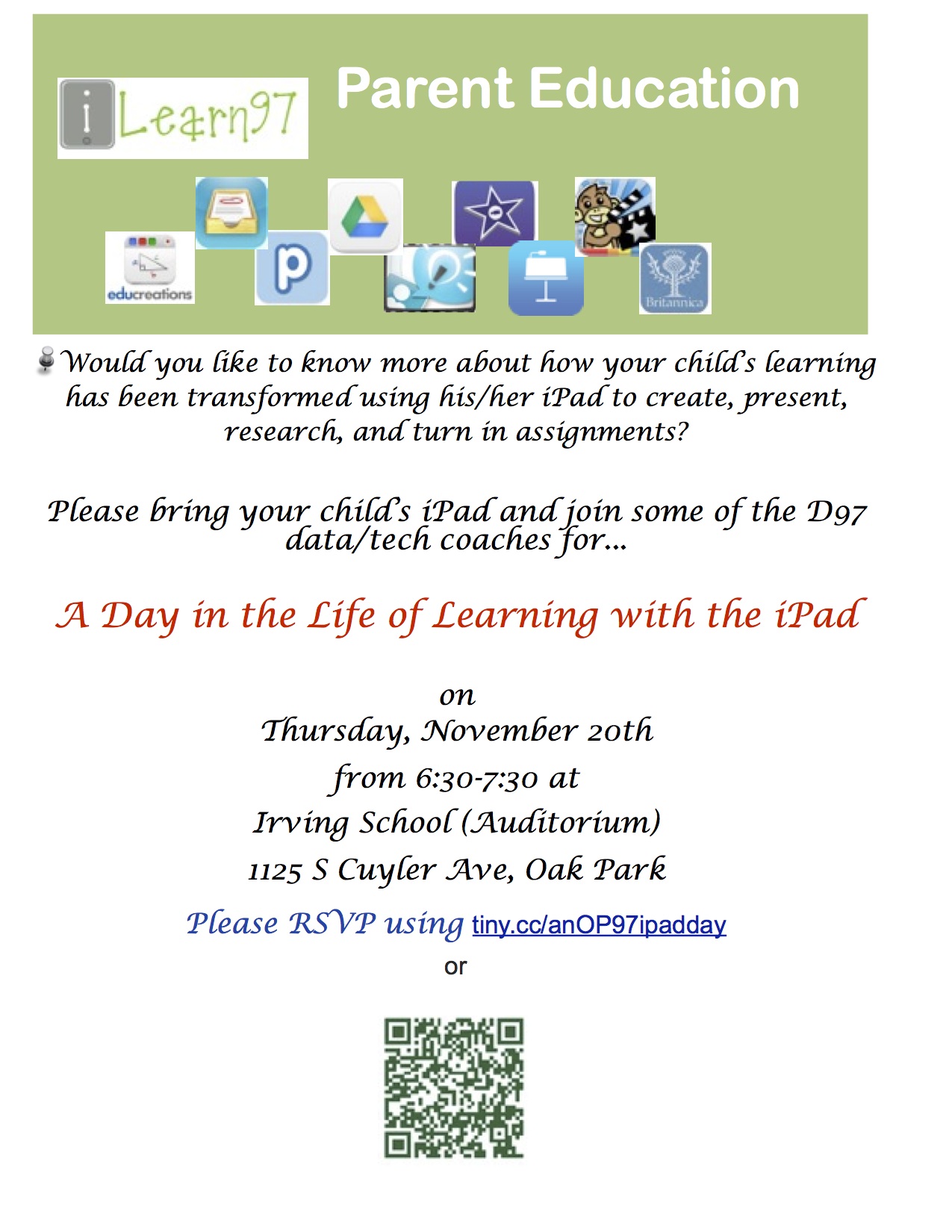 iLearn 97 Parent Education Learn more about how your child’s learning has been transformed by using her/her iPad to create, present, research and turn in assignments! Join us on Thursday, November 20th! More details HERE!! Like Loading... Related