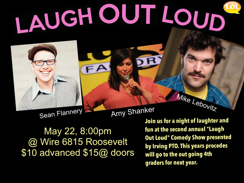 WHO WILL PROVIDE THE LAUGHS? These find people from our very own Irving community – – Mike Lebovitz, Sean Flannery, Amy Shanker, and 4th grade teacher Emile Williams!