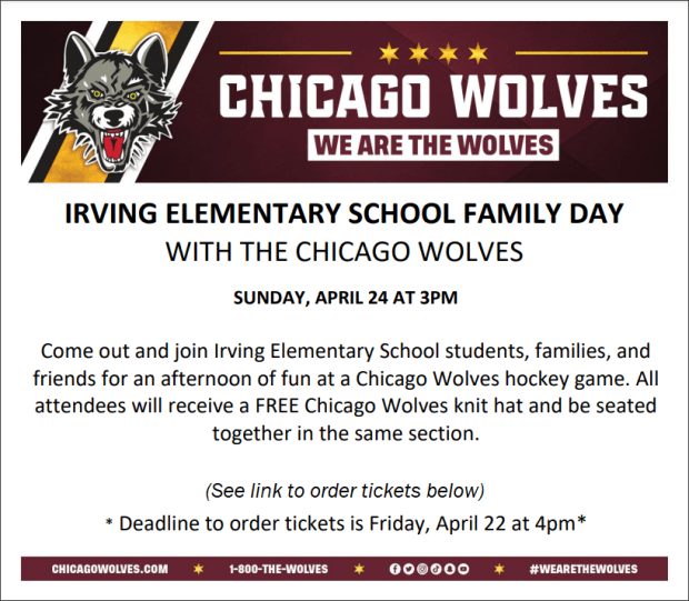 Tickets are $17.50 each (regularly $26, but discounted for Irving students, families and friends) and can be purchased here: https://fevo.me/irvingschool. Plus, everyone who attends will receive a Chicago Wolves knit hat! This is not a school fundraiser; just a chance to enjoy an afternoon of fun with some fellow Irving Eagles. Hope to see you there!