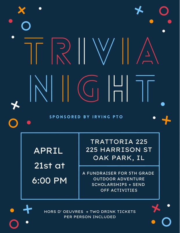One of Irving’s most beloved traditions is back! Put on your thinking caps and join the Irving community for a night of trivia and laughs! The event is deejayed by our own Mr. Sak! There will be raffles, 5th grade class baskets and a Split the Pot!