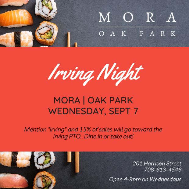 The Irving PTO is excited to be collaborating with MORA on Harrison Street this coming Wednesday, September 7, to help support local business AND the Irving PTO all in one night! Just mention “Irving” when you dine in or take out on Sept. 7 and 15% of your purchase will go towards the Irving PTO. It’s a win-win!