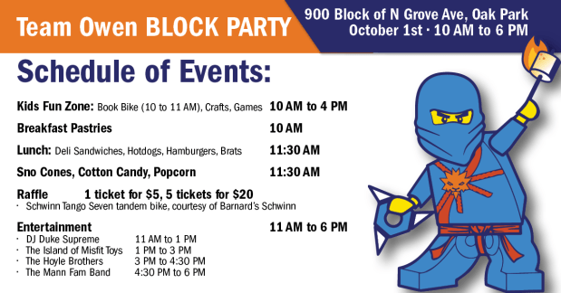 This community event is organized by the Family of one of our D97 Mann Mustangs, Owen Petrzelka, who in October 2020 lost his brave 6-month battle against DIPG, the deadliest form of childhood brain cancer. Since 2020, his family has organized a virtual 5K run, in conjunction with the ChadTough Defeat DIPG Foundation, to raise funds for childhood brain cancer research. This year’s 3rd annual virtual 5K run is scheduled for Saturday, October 1 and it’s not too late to sign up! But whether or not you are interested in running, we have great news!! This year, there will be an even bigger community event in order to try to live up to one of Owen’s mottos: “making someone happy is our job”. To that end, on race day, the 900 N Grove block in Oak Park will be turned into a community fun zone where community members, whether they are running or not, can stop by throughout the day for some fun kids’ activities, food/drinks, and live music. Visit the Event Webpage for more details and logistics information.