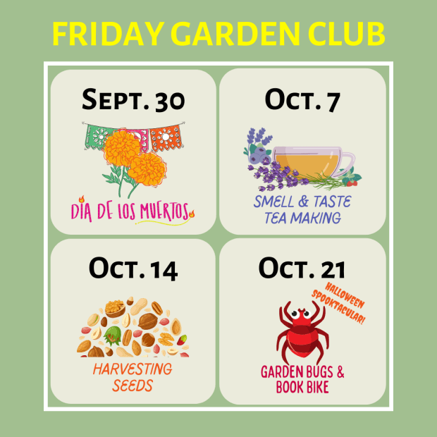 We’ve still got a few weeks left of getting our hands dirty at Garden Club! Every Friday after school, join us in the Irving garden for about an hour (approx. 3pm-4pm). We’ve got a wonderful schedule for the remainder of the fall season: