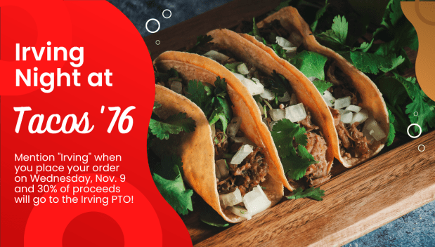 Forget about Taco Tuesday — this Wednesday is Irving Night at Tacos ’76!! Just mention “Irving” when you place your order on Nov. 9 and 30% of all sales proceeds will go toward the Irving PTO. Ok ok you can have tacos on Tuesday too, as long as you don’t forget to place your Wednesday order for Irving!