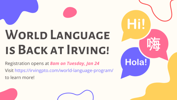 The World Language Program at Irving School is an introduction to different languages and cultures. In these classes, students will learn basic communication vocabulary. This year we have EIGHT languages available: American Sign Language (ASL), French, German, Greek, Japanese, Mandarin, Portuguese, and Spanish. Classes will take place once per week during lunch/recess for approximately 12 weeks beginning January 30. Scholarships are available! Visit our World Language Program website to see the class schedule, registration information and more: https://irvingpto.com/world-language-program/