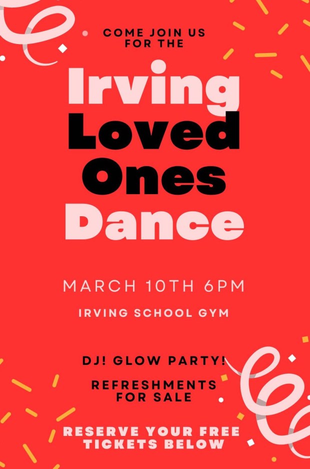 Please join us for this WHOLE FAMILY event at the school gym! All Irving students, staff and their families are invited. As this is an event meant for the whole family, all kids will need a parent or guardian with them. And even though it’s a free event, we need every person attending to reserve a ticket so we can plan food, drinks and space accordingly. It’s going to be tons of fun and we can’t wait to see you there!