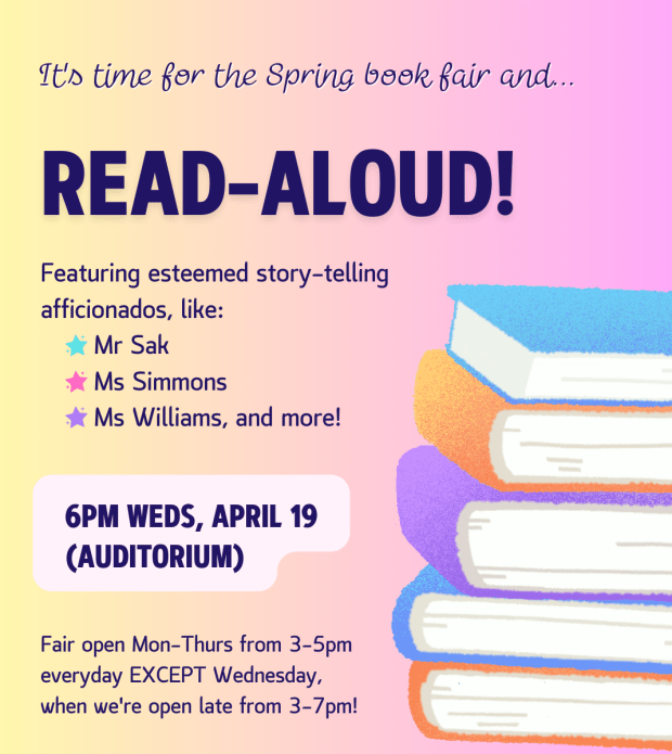 It’s time for the Anderson Book Fair!! We’ll be set up for shopping Mon-Thurs this week in the kindergarten hallway! Class previews will take place during school on Monday and Tuesday, followed by a very special Spring Read-Aloud event in the school auditorium on Wednesday evening at 6pm!