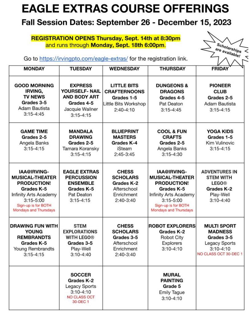 - Parent Volunteers needed! We always can use help organizing the Eagle Extras program. We have many roles available from helping behind the scenes to helping on-site at dismissal time. Please reach out to eagleextras@irvingpto.com to find out more and get involved.”